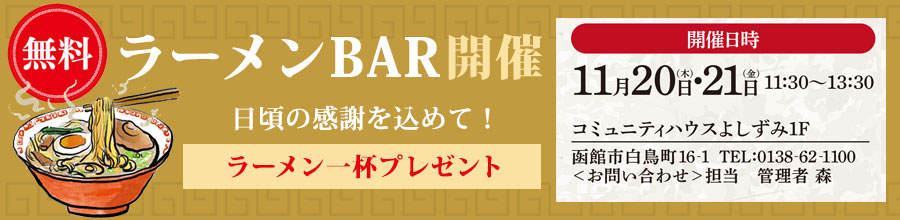| 2025.10 | らーめんBARを開催いたします! NEW 【白鳥】11月20日(木)・21日(金)11:30~13:30 【梁川】11月25日(火)・26日(水)11:30~13:30 |
