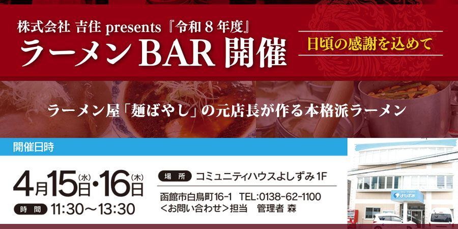 | 2026.4 | 春の「らーめんBAR」を開催いたします!NEW 【白鳥】4月15日(水)・16日(木)11:30~13:30 【梁川】4月22日(水)・23日(木)11:30~13:30 |